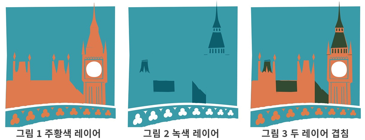 그림 1은 녹색 단색판/레이어를 나타내고 그림 2는 주황색 단색판/레이어를 나타냅니다.