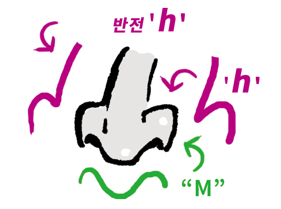 앞에서부터 ‘M’과 ‘h’를 이용해 코를 그립니다.