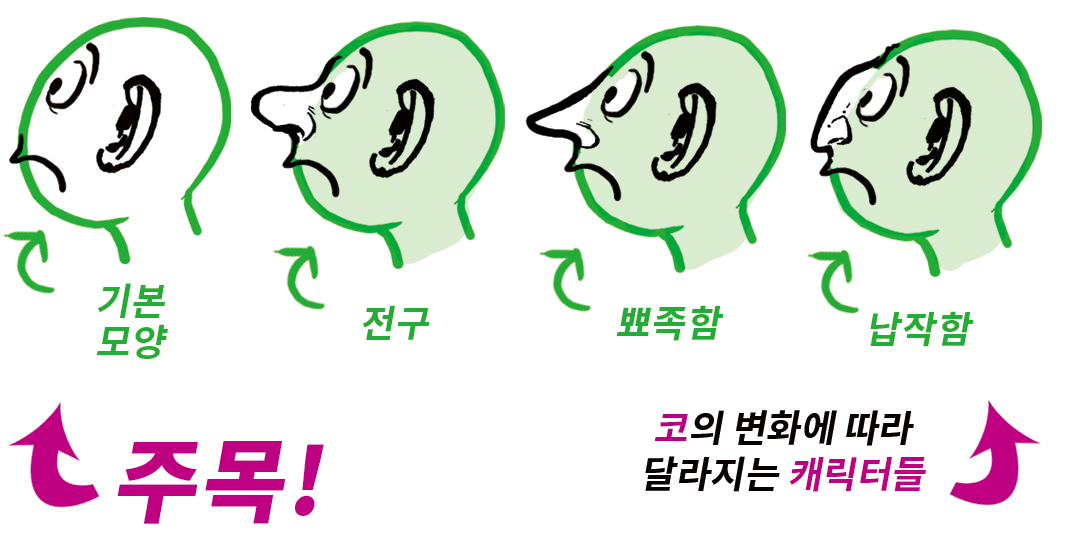 옆얼굴에서 캐릭터의 코는 얼굴에서 가장 선명한 형태입니다!