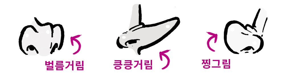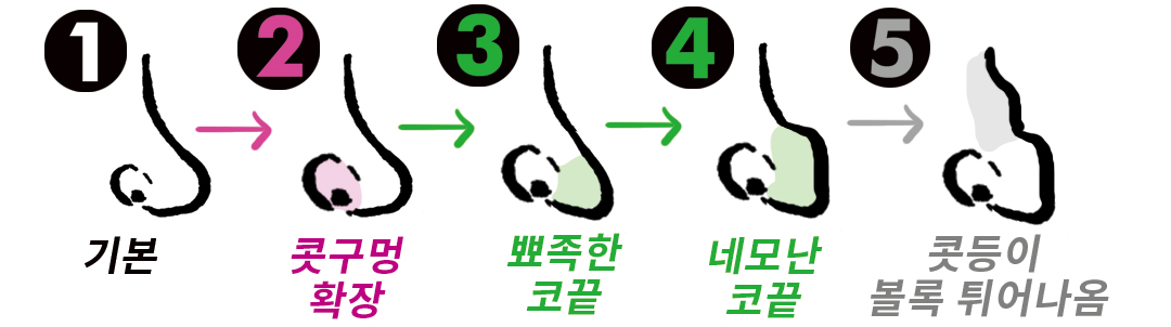 <주의> 콧등뼈는 움직이지 않는 단단한 뼈지만, 코끝과 콧구멍에는 움직임이 있습니다.
