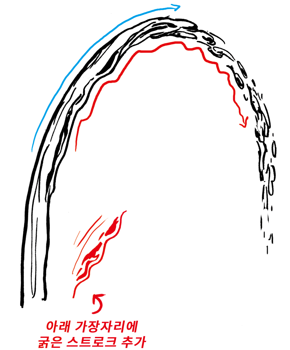 물이 높은 곳에서 쏟아질수록 부드럽게 휘어집니다.