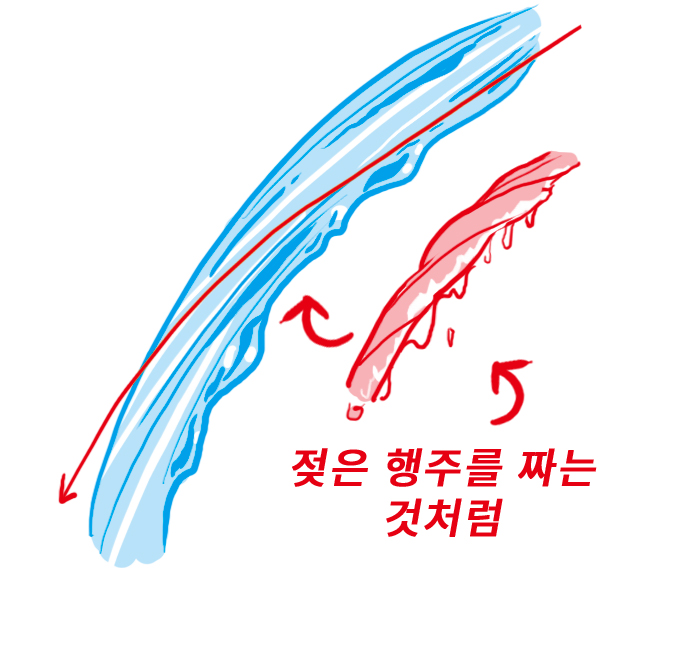 - 액체가 흐르는 각도에 따라 튀긴 액체가 유리잔 한쪽으로 치우치게 됩니다.