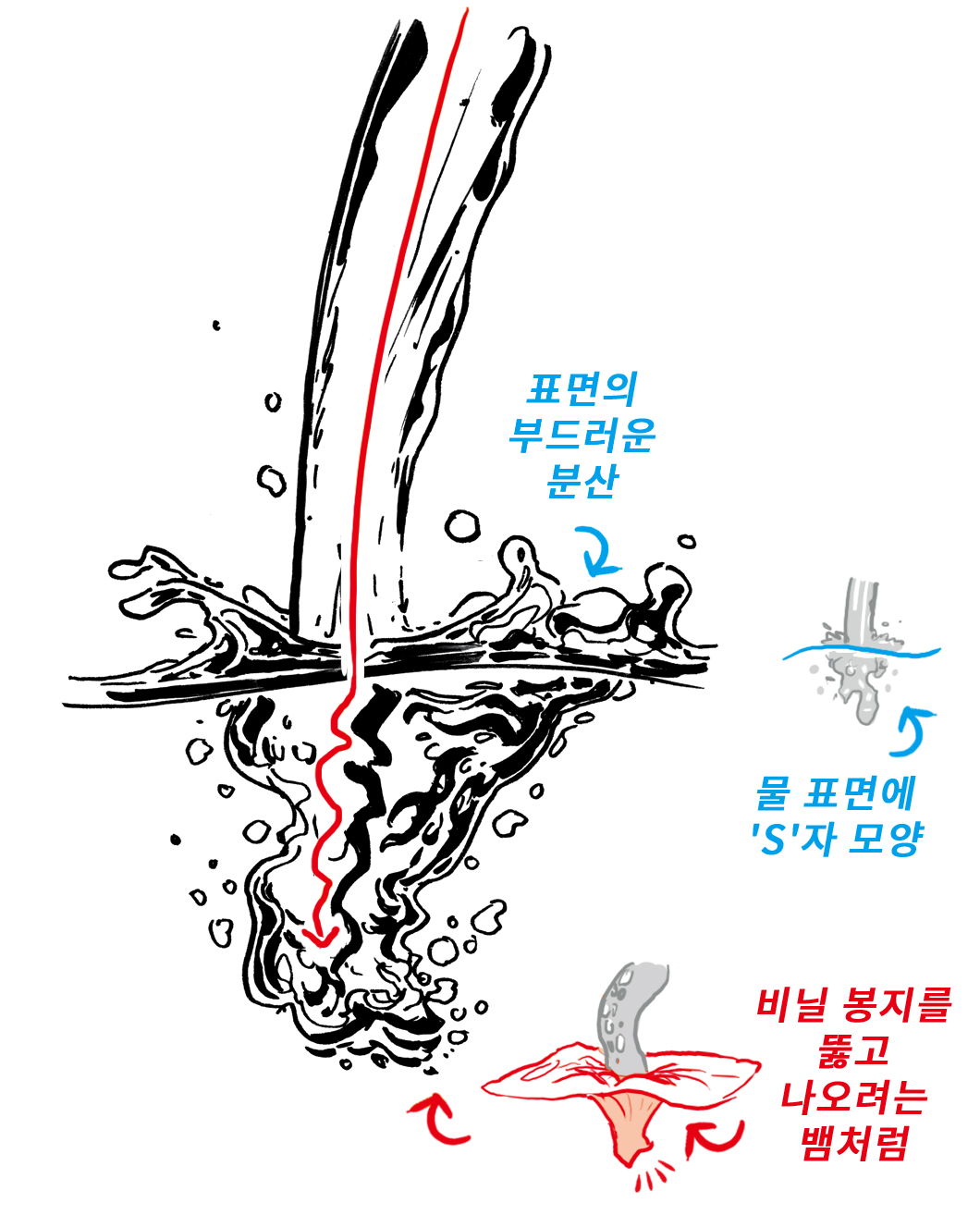 물체가 물에 닿으면 물보라가 튀깁니다.