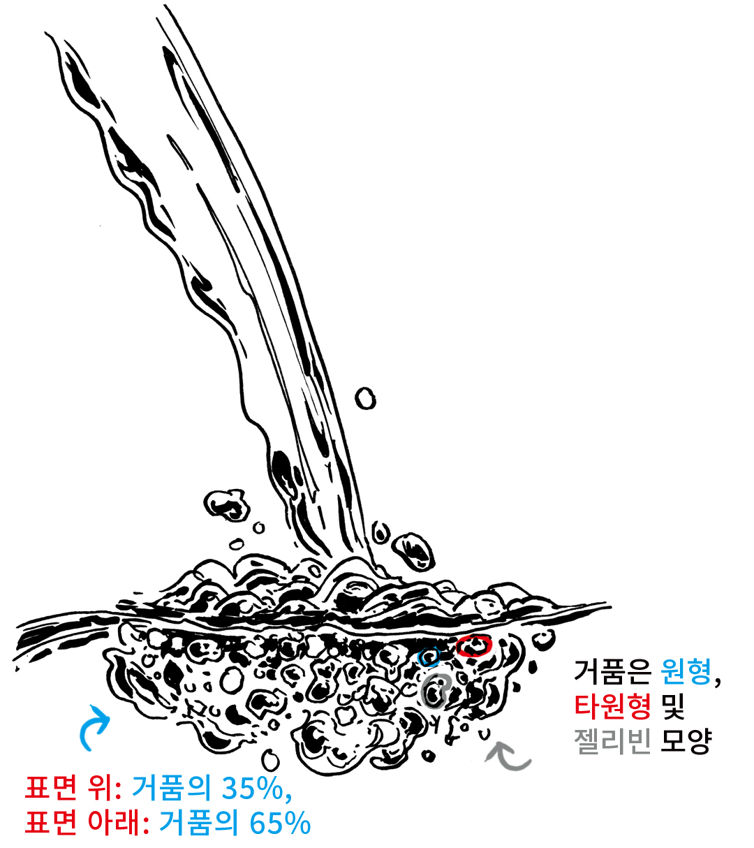 처음 부딪힌 후 표면 아래의 물은 많은 거품이 일어 부글거립니다.