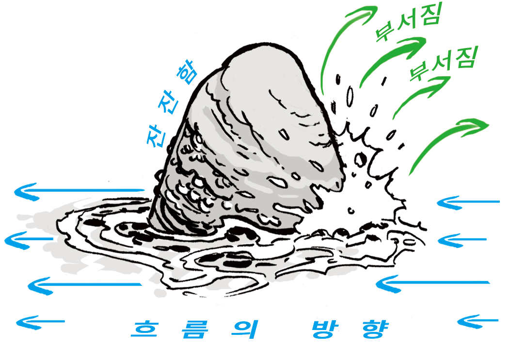 고정된 물체에 부딪혀 어느 쪽으로 부서지는지 물이 흐르는 방향을 보여줍니다.