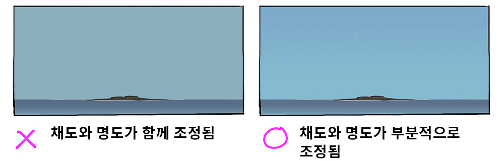 하지만 우리 눈이 하늘을 포착하는 방식에 대해 영향을 미친다고 합니다. 새벽이 오면 눈은 주위의 어두운 색에 익숙해져 있어 새벽 하늘은 생각보다 밝아 보입니다. 한편 눈은 늦은 오후(황혼)에 피곤하고 밝은 대낮의 주변 환경에 익숙해져 있어 황혼의 하늘은 예상보다 어두워 보입니다. 맑은 날 밖에 있다가 방에 들어갈 때처럼 말이죠. 눈이 적응하기 전까지는 방이 정말 어두워 보일 것입니다. 이 정보를 사용하여 저는 대개 새벽에는 더 부드럽고 따뜻한 색을 사용하고 황혼에는 더 선명하고 대비되는 색을 사용합니다. 이렇게 하면 이미지를 보는 것만으로도 새벽과 황혼의 하늘을 구별할 수 있습니다.