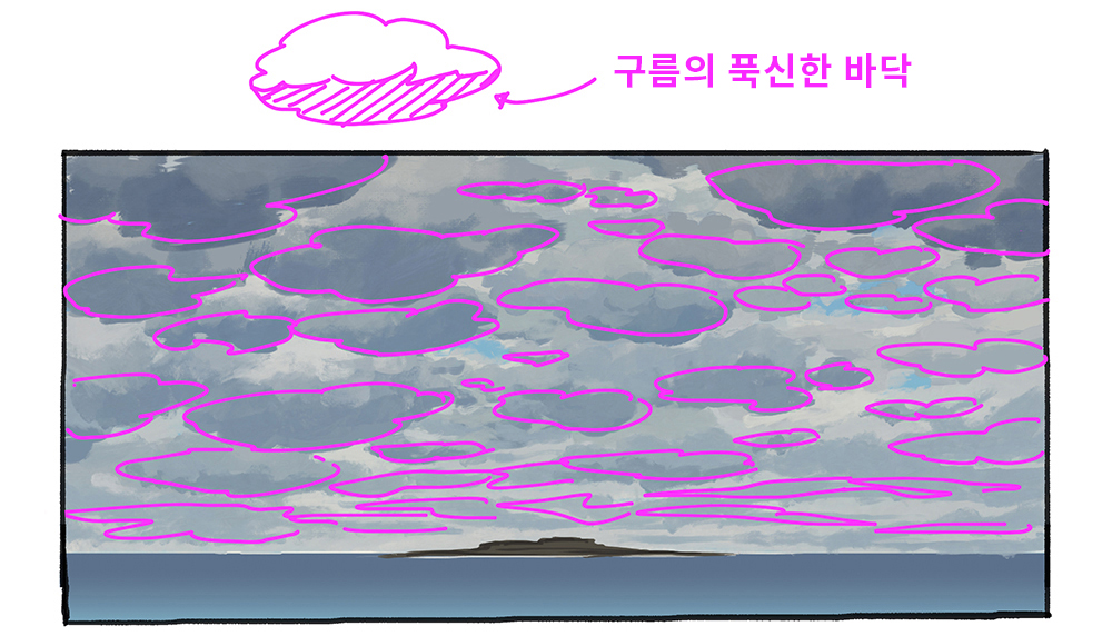 더 입체적으로 보이도록 낮은 구름을 그립니다.