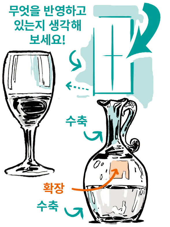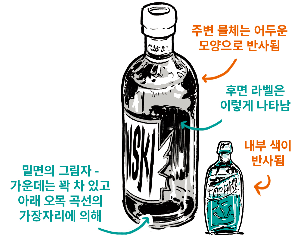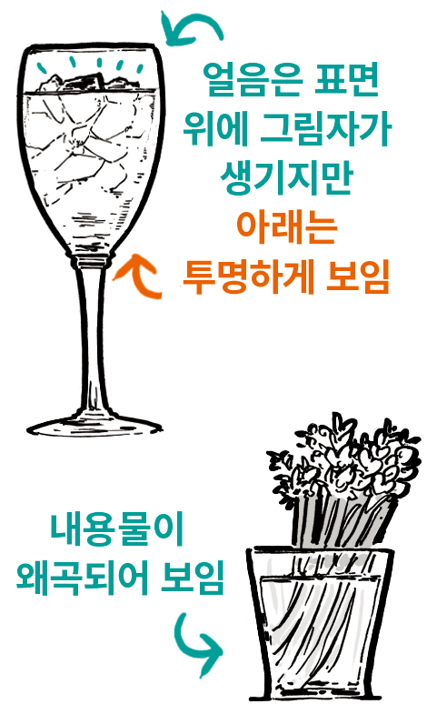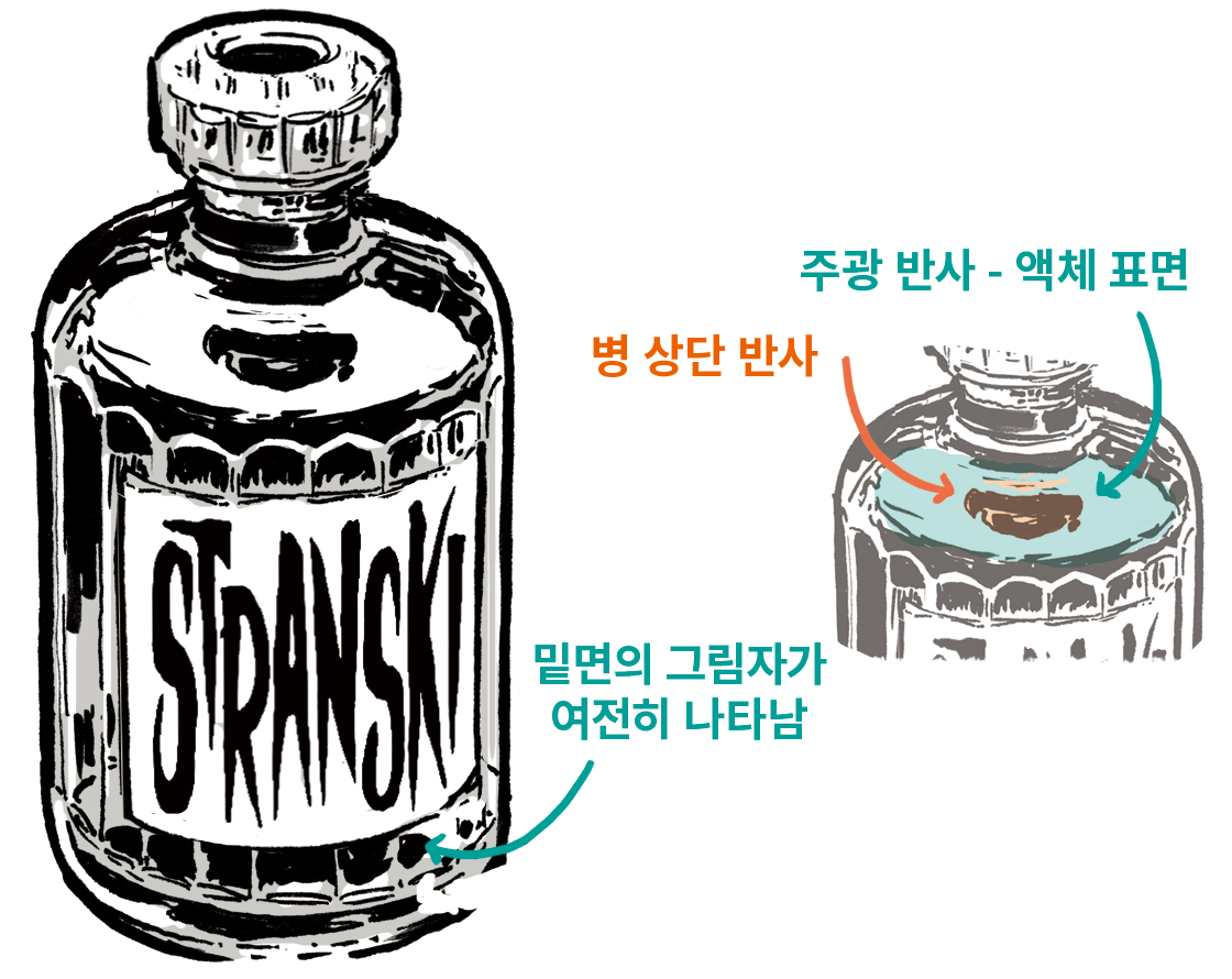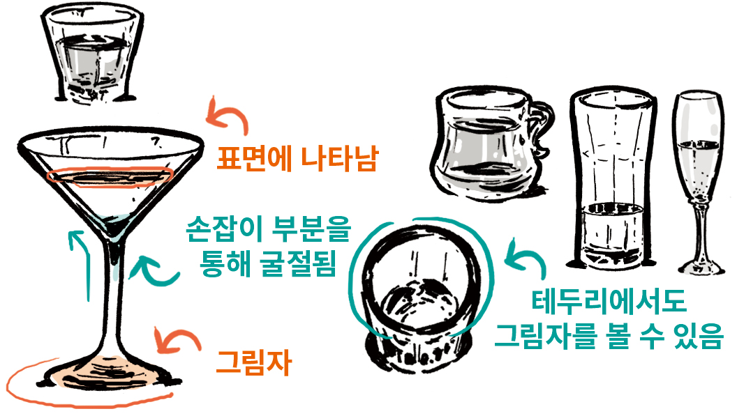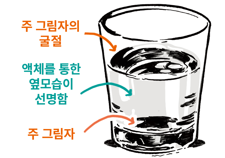 투명한 액체가 담긴 유리잔의 경우 특정 각도에서 보았을 때 밑면의 그림자가 표면에 굴절됩니다.
