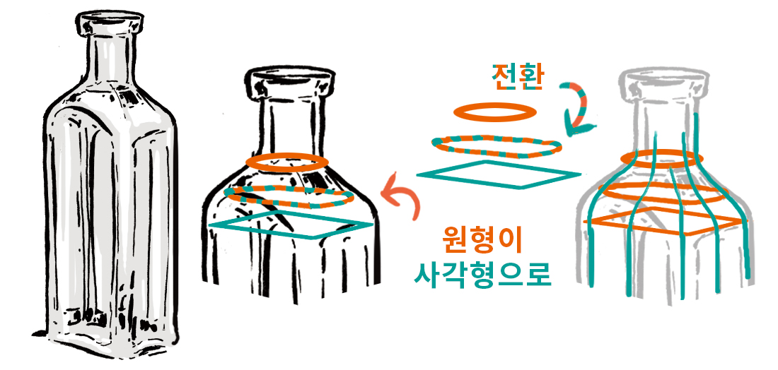 모양이 변형된 병의 경우 중간 지점의 단면을 상상해 보세요.