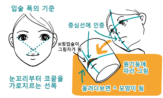 먼저 폭을 정한 다음 아랫입술의 가운데와 윗입술산 부분을 정해 선으로 연결하면 입술 모양이 됩니다. 얼굴 각도가 바뀌어도 십자 중심선을 기준으로 ‘폭, 아랫입술 가운데, 인중을 정한다’는 그리는 법을 익혀 두면 입의 위치가 크게 벗어나지는 않을 것입니다.