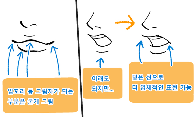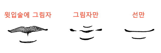 또한 ‘위를 덮고 있는 곳의 선은 길게 그린다’는 이른바 ‘덮은 선’ 표현을 익혀 두면 적어도 선이 입체적인 그림이 됩니다. 다문 입의 위아래 입술이 겹쳐진 부분이나 입을 벌렸을 때의 입술과 입안을 그릴 때 이 기법을 사용할 수 있습니다.