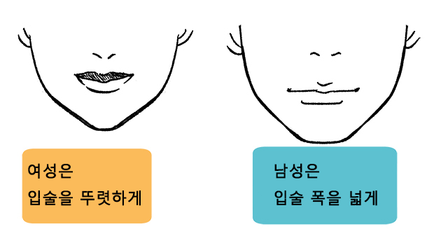 입술을 뚜렷하게 그리면 여성스러운 입이 됩니다. 남성다움을 표현하려면 입술 폭을 넓게 그립시다.