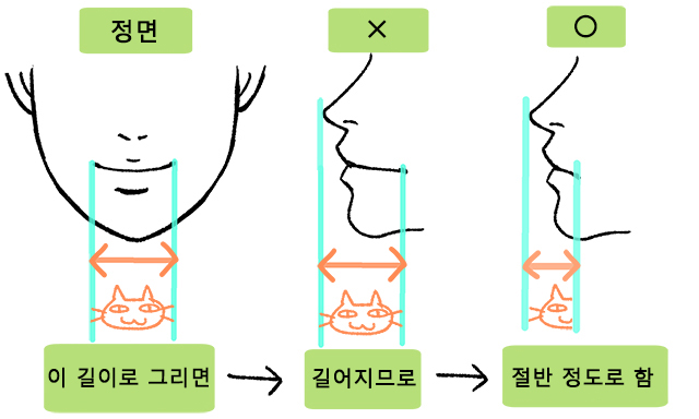 입술 옆모습은 정면에서 보았을 때의 절반 정도의 폭입니다. 윗입술은 코보다는 나오지 않고, 아랫입술은 윗입술보다 들어갑니다. 옆에서 보았을 때 윗입술 끝이 약간 위를 향하고 있으면 ‘오리 입’처럼 보입니다. 얼굴을 아래 각도에서 올려다 본 경우 입술은 조금 코에 가까워집니다.