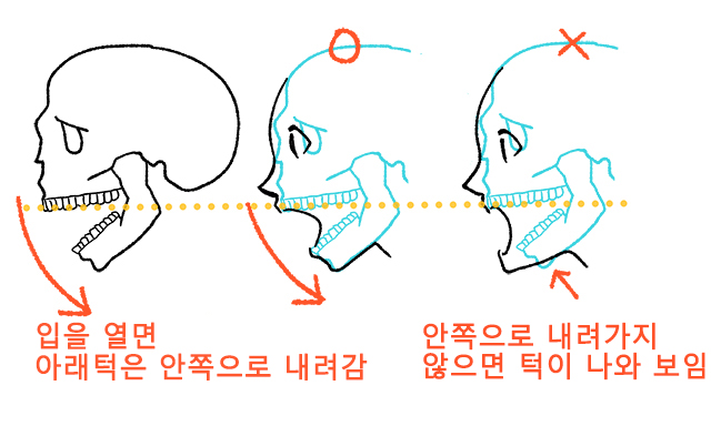 골격을 떠올리면 알겠지만 크게 입을 열었을 때는 턱이 안쪽으로 내려갑니다. 그래서 얼굴의 윤곽선을 조금 당겨진 느낌으로 하여 그에 맞게 입을 그리면 좋습니다.