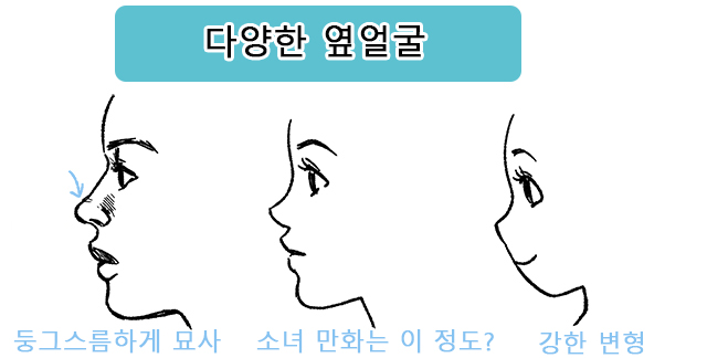 옆에서 보았을 때 비근(눈 사이의 코뿌리), 인중(코 아래부터 윗입술까지 이어진 홈), 턱끝이 모두 같은 높이가 되는 것을 기본으로 합니다. 이를 바탕으로 코의 길이와 둥그스름함 등을 캐릭터에 따라 바꾸면 좋을 것입니다.