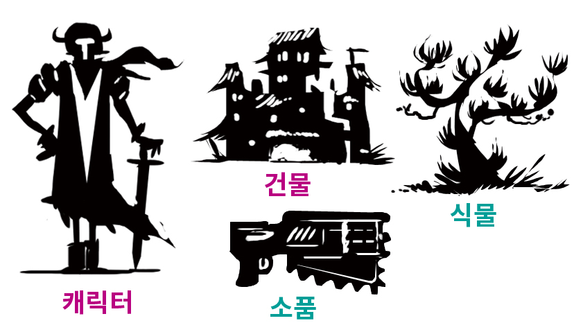 섬네일 실루엣은 캐릭터, 건물, 식물, 소품 등 모든 것을 디자인하는 데 사용할 수 있습니다.