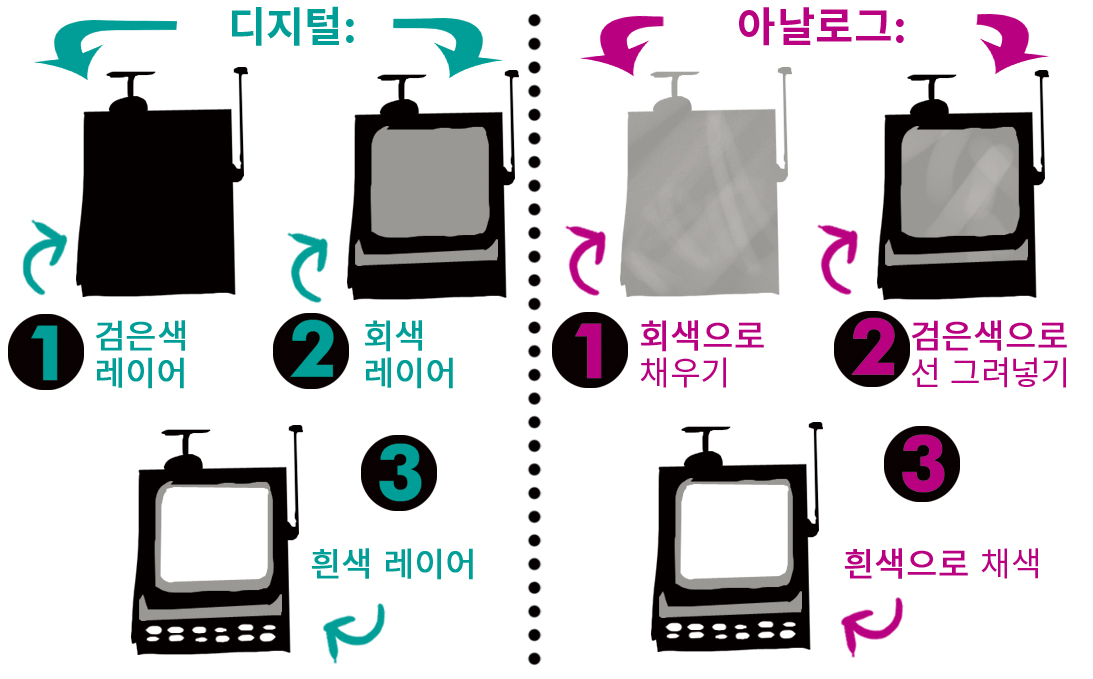 이를 만드는 데 사용하는 디지털 및 아날로그 매체에 기반한 세 가지 톤 방법이 있습니다.