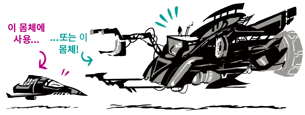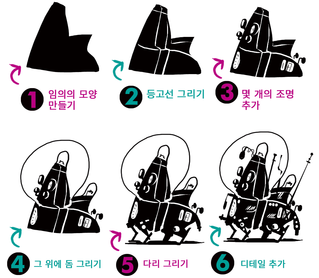 임의의 모양을 그립니다. 모양이 어떻게 생겼는지는 중요하지 않습니다. 그냥 시험 삼아 여러모로 그려보세요. 그런 다음 등고선을 그립니다. 거기에 몇 개의 조명과 돔을 추가할 수 있습니다. 이제 과감하게 다리를 몇 개 그려넣어 봅시다! 그리고 마지막 디테일을 그려넣어 마무리하세요! 임의의 모양을 재미있고 미래 지향적인 움직이는 아이템으로 바꾸었습니다.