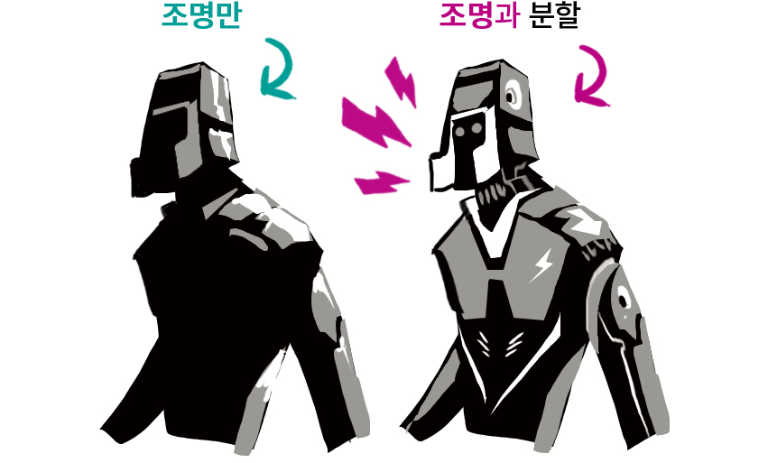 이는 매우 중요합니다! 조명을 암시하는 용도로만 중간 톤과 흰색을 사용하지 마세요. 조명과 단면에 사용하세요.