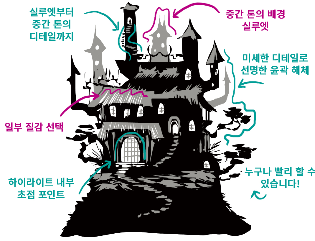 앞서 설명한 실루엣 섬네일 기법을 바탕으로 배경 구도에 적용하여 만화와 일러스트에 대한 풍부한 아이디어를 제공합니다.