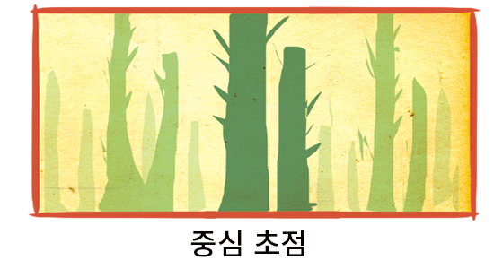 전경, 중경, 배경 등에 많이 있는 같은 물체로 눈높이 환경을 만들 때 컷 안에서 물체의 배치를 사용해 초점을 맞추려는 위치로 독자의 시선을 이끌 수 있습니다. 이 경우 전경을 사용하여 독자의 시선을 이미지 중앙으로 이끈 후 중경과 배경과 함께 점차 컷의 가장자리로 향하게 합니다.