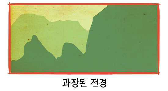전경, 중경 및 배경의 일반적인 위치를 반전하여 역동적인 장면을 만듭니다.