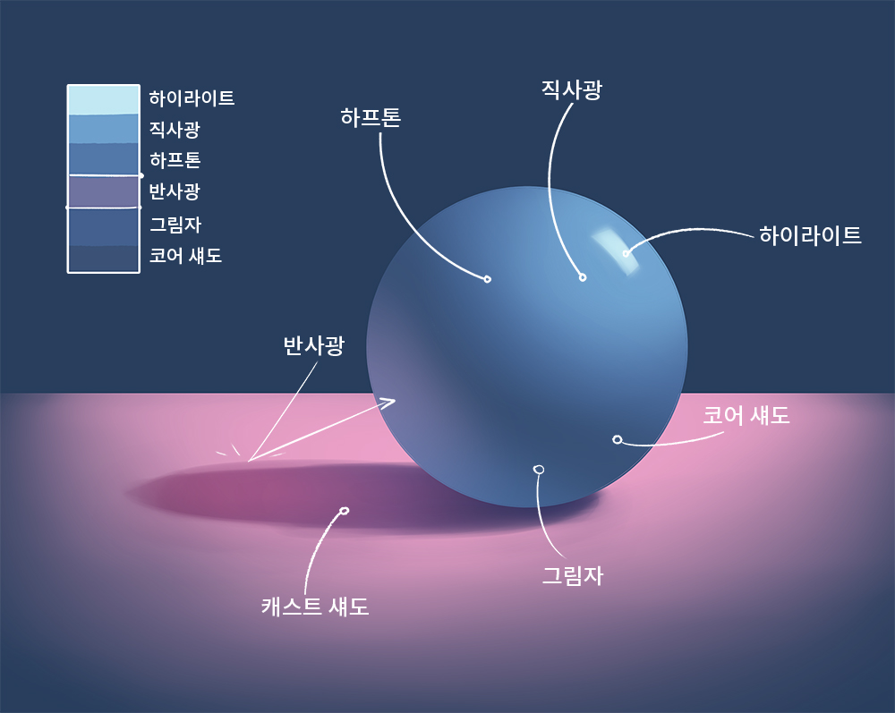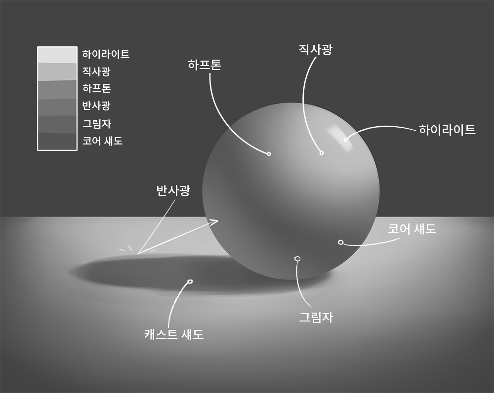 - 하프톤: 여기에서 값이 빛과 그림자 사이의 중간 지점으로 어두워지기 시작합니다. 물체의 기본색(바탕색)이라고도 합니다.