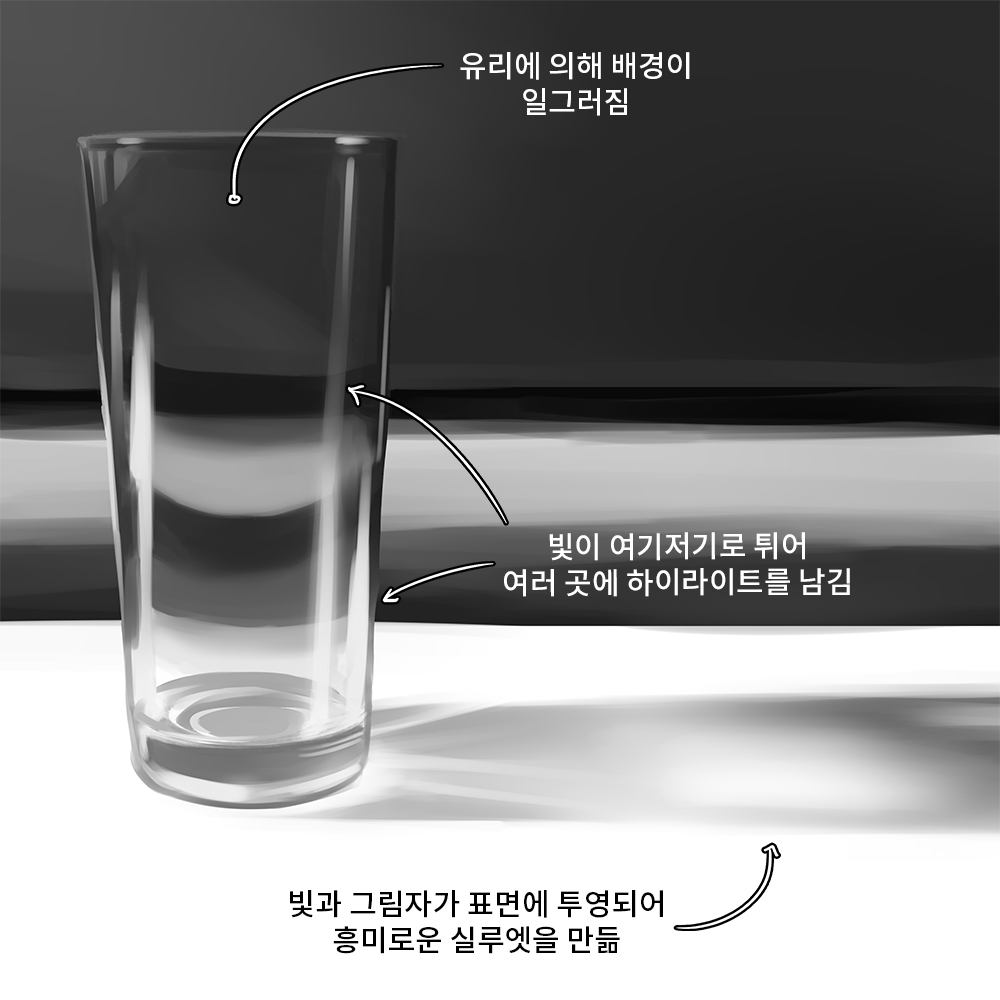 투명한 물체는 더 많은 빛을 투과시킬 수 있습니다. 이러한 유형의 물체를 그리는 것은 일반적으로 더 복잡합니다. 디테일에 주의를 기울여야 합니다! 유리에서는 다음과 같이 빛이 투과됩니다.