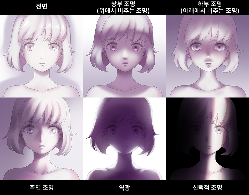 다음 예에서는 동일한 그림을 바탕으로 다른 광원을 모방하려고 했습니다. 회색조로 볼 수도 있습니다.