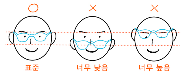 귀의 상하 배치는 맨 위의 귀 테두리가 눈썹 정도, 맨 아래가 코 끝 정도라는 것을 기준으로 합시다. 안경다리를 걸치는 위치라고 유의하면 됩니다. 소녀 만화풍의 그림의 경우 너무 낮은 위치에 그리는 사람이 많은 것 같으니 주의합시다.