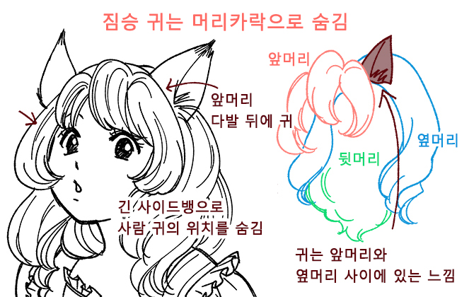 또한 짐승 귀를 한 캐릭터에 사람 귀를 그려야 하는지에 대한 의문이 있습니다만, 각 개인이 설정하기 나름이라고 생각합니다. 일반적으로는 사람 귀의 위치는 머리카락 등을 덮어 그리지 않는 경우가 많은 것 같습니다.