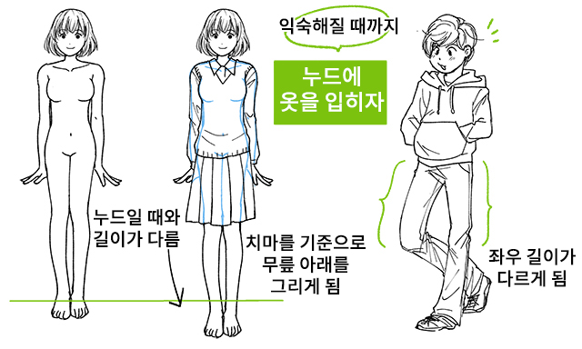 그 결과 다리가 몹시 길거나 무릎 위치가 이상하게 됩니다. 다리 그리는 연습을 막 시작했다면 우선 맨다리를 그린 후 옷을 입히도록 합시다.