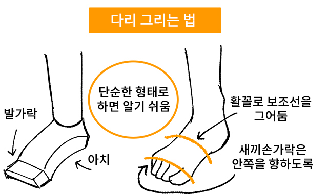 과감하게 그리라고 해도 똑바로 그리면 무다리가 될 수 있으니 ‘곡선’과 ‘관절’에만 집중합니다. 먼저 밑그림으로 다리의 대략적인 크기를 그리면 선 그리기에만 집중할 수 있을 것입니다.