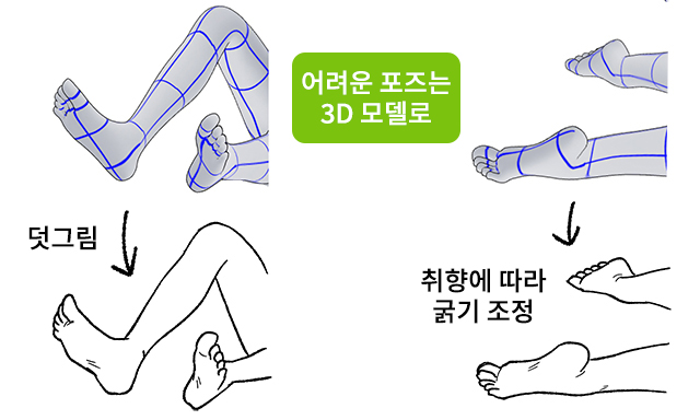 다시 말하지만 일러스트는 변형된 것입니다. 실물에 가까운 인체를 잘 못 그리겠다면 차라리 과감하게 선을 그읍시다.