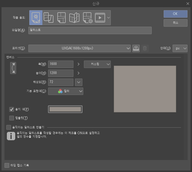 새 캔버스를 만들 때 기본 용지 색을 설정할 수 있습니다. 저는 이 중간 톤의 따뜻한 회색을 기본값으로 설정했습니다.