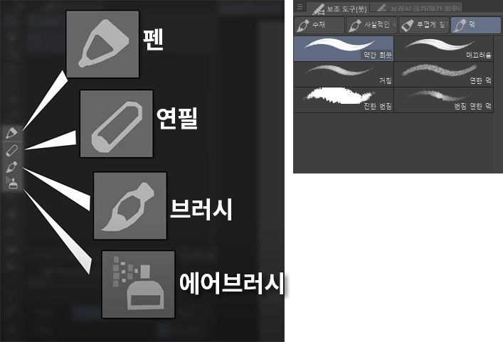칠하는 데 사용하는 주요 브러시는 이 네 개의 아이콘 아래에 있습니다. 그 중 하나를 클릭하면 보조 도구 메뉴에서 브러시를 추가로 선택할 수 있습니다.