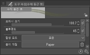 브러시 중 하나를 클릭하면 아래 표시된 도구 속성 팔레트에서 특정 브러시를 미세 조정할 수 있습니다. 옵션에는 브러시 크기, 불투명도, 혼합 모드 및 모방할 수 있는 여러 질감이 포함됩니다. 그리고 좋은 점은 다른 브러시를 선택하면 다른 사용자 지정 가능한 컨트롤을 사용할 수 있다는 것입니다. CLIP STUDIO에서 작업할 때는 이 부분을 많이 다루었습니다.