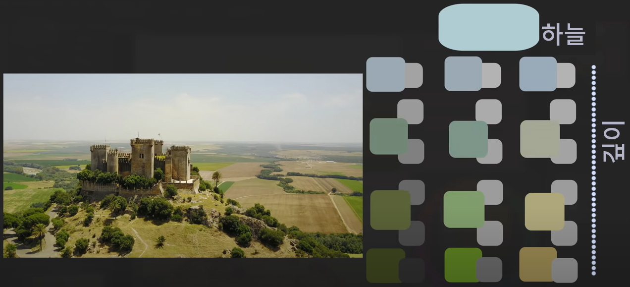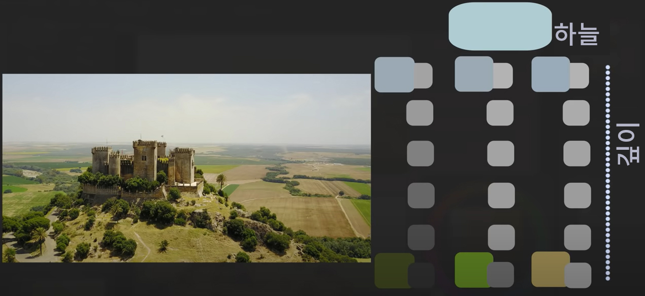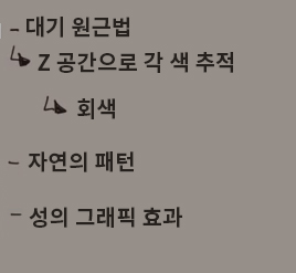 가장 어두운 것인 나무는 통과하는 값이 많다는 이유만으로 가장 많은 변화가 생깁니다. 이 사진에서 볼 수 있는 것처럼 수평선을 바로 볼 수 있다면 결국 모든 것이 같은 값으로 압축됩니다. 색도 마찬가지입니다. 사진과 같이 하늘에 희미한 파란색을 넣을 것입니다. 색이 점점 멀어질수록 해당 하늘색의 영향을 받습니다. 이는 충분히 이해하기 쉽다고 생각합니다. 하지만 거기에 색을 넣는 것은 어렵습니다.