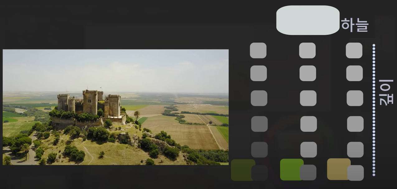 이 장면의 기본색 중 다음 세 가지 색을 살펴보겠습니다. 나무의 초록색, 평야의 초록색과 황갈색과 각각의 해당 값입니다.