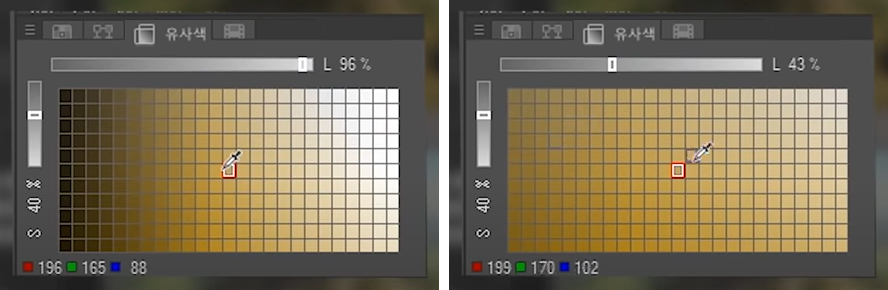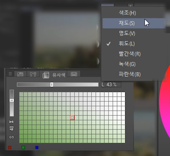 채도와 명도가 서로 다른 유사색을 보여 주므로 밝게 하여 아주 조금만 채도를 낮추려면 해당하는 타일을 클릭합니다. 물론 메인 컬러 세트와 컬러써클에서도 색이 업데이트됩니다. 이 휘도 슬라이더를 사용하여 이 주변에 표시되는 값 수를 설정할 수도 있습니다. 높은 값으로 설정하면 모든 범위의 값들에 접근할 수 있고, 낮은 값으로 설정하면 이 색들처럼 유사색을 추출할 수 있습니다.