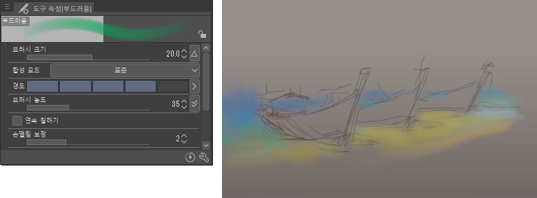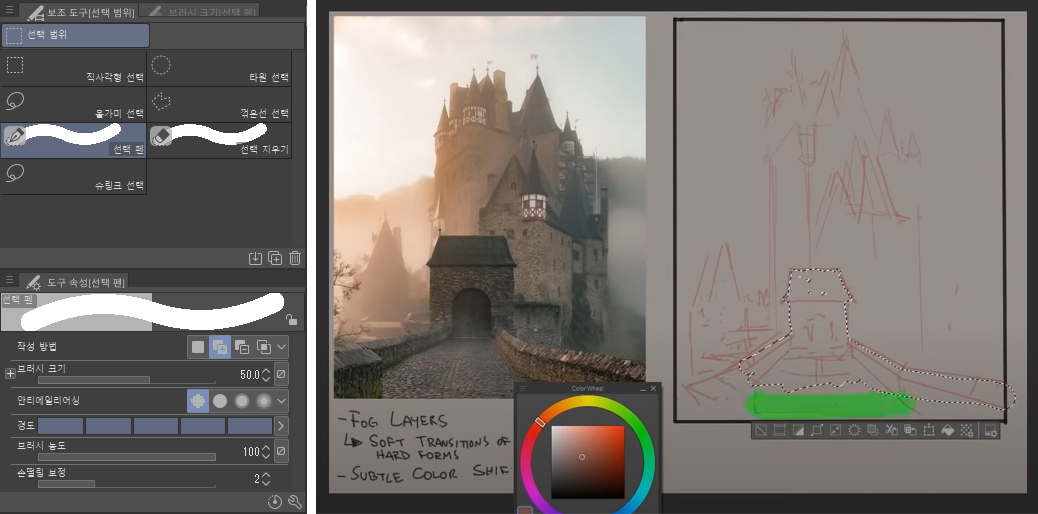 저는 CLIP STUDIO PAINT(클튜)의 얇은 구아슈 브러시와 둥근 수채화 브러시를 자주 사용하고 있습니다. 이 두 브러시는 이미 캔버스에 있는 색과 잘 어울립니다. 또한 일반적으로 작은 수정을 많이 할 것이므로 대기 원근법을 그릴 때 정말 중요합니다.