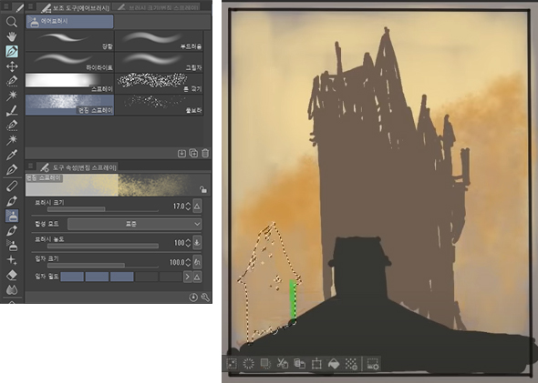 연구로 돌아가서, 그 간단한 구조 위에 장면을 어떻게 만들었는지 볼 수 있습니다. 그리고 물론 그 위에 주름이나 디테일을 추가할 수 있습니다. 예를 들어 여기에서는 물보라 에어브러시를 사용하여 왼쪽에 덤불을 그립니다.