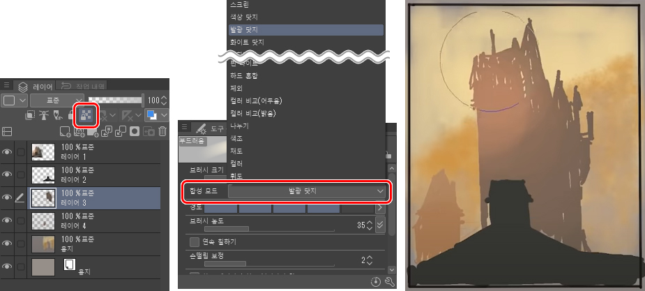 큰 성 레이어를 선택하고 여기에서 이 잠금 버튼을 눌러 발광 닷지 모드로 설정하면 매우 큰 에어브러시로 칠할 수 있습니다. 어쨌든 큰 브러시로 칠할 수 있으며 나중에 그려지는 픽셀에 그림이 고정됩니다. 결국 성 부분은 그대로 유지됩니다.