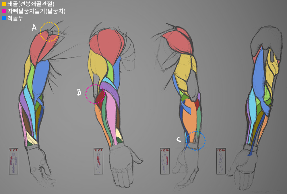 아티스트 Dani Puente 씨가 설명하는 해부학적으로 올바르게 팔을 그리는 방법에 대한 강좌입니다. 팔 부위별 비율 및 근육 명칭을 그림과 함께 설명하고 팔을 올리거나 손목을 돌려 뼈와 근육이 어떻께 움직이는지 팔 그리는 요령을 설명합니다.