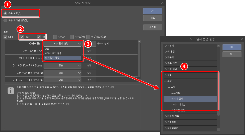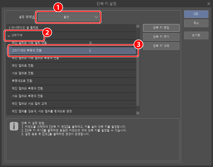 - 그리기색과 투명색 전환용 단축 키를 설정합니다. (저는 왼손잡이라서 단축 키를 ‘L’로 설정하고 키보드의 오른쪽 부분을 단축 키로 사용하지만, 여러분은 좋아하는 것을 자유롭게 사용하세요.)