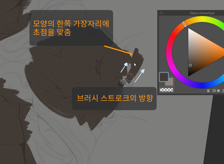 모양을 칠할 때 대개 한쪽 가장자리에 집중하므로 스케치에서 벗어나도 개의치 않고 넓은 스트로크로 칠합니다.