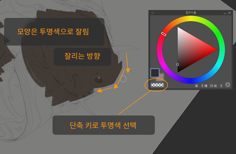 이제 그리기색과 투명색 전환 기능으로 스케치에서 벗어난 부분을 수정하겠습니다. 지우개를 대신 사용할 수도 있지만, 지울 때 동일한 브러시와 크기를 유지하여 일관성 있는 모양을 유지하고자 합니다.
