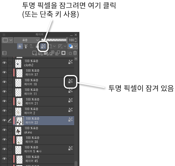 - 투명 픽셀 잠금용 단축 키를 설정합니다.