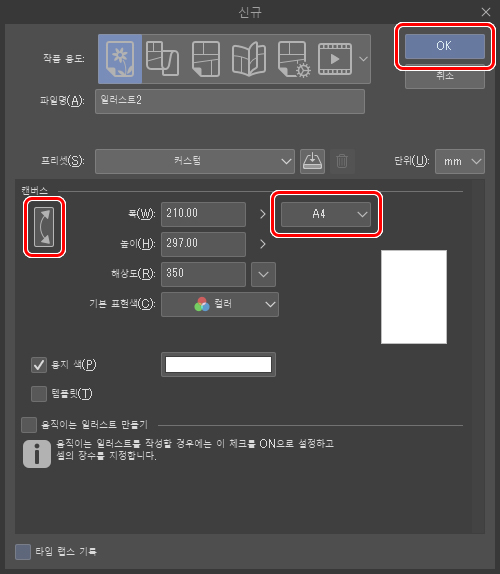 먼저 CLIP STUDIO PAINT(이하 클튜라 함)를 열어 새 파일을 만듭니다. 여기에서는 A4 크기(세로)의 캔버스를 열었습니다.