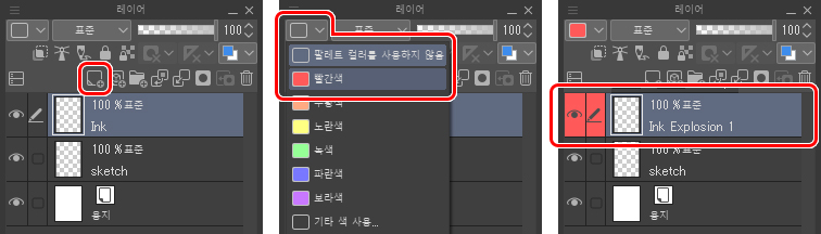 이 간단한 스케치가 완료되면 밑그림 레이어 위에 새 레이어를 만들어 Ink Explosion 1(폭발_펜 터치 1)로 이름을 바꾼 다음 이후 단계에서 빠르게 찾을 수 있도록 빨간색으로 지정합니다. 이 레이어에서 펜 터치로 불과 연기의 입체감을 묘사합니다.